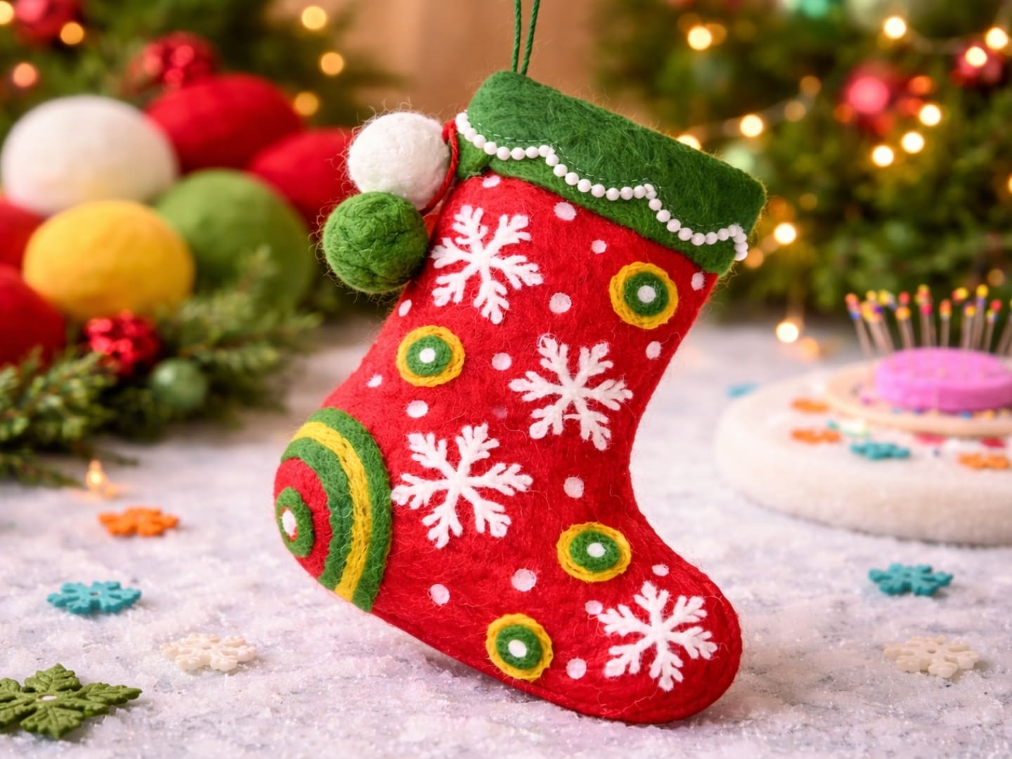 You’ll be introduced to both wet felting and decorative needle felting, learning how to layer vibrant wool fibres to build structure before adding character through surface detail. With a wide choice of festive colour palettes, textures, and embellishments — including pom-poms, beads, and playful decoration — your stocking can be traditional, whimsical, bold, or quietly elegant, completely shaped by your own style.